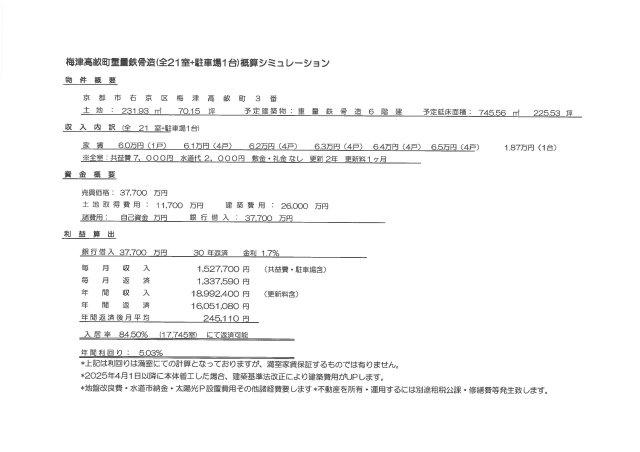 また、予定賃料収入が確実に得られる事を保証するものではありません。